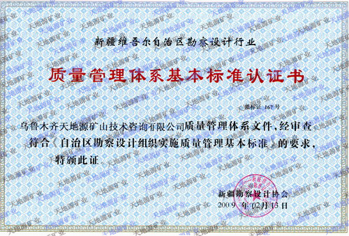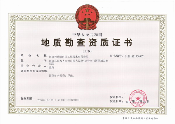 新疆天地源地勘公司成立于2004年,歷經(jīng)十余年的發(fā)展,現(xiàn)持有地質(zhì)勘查甲級資質(zhì)和ISO9001:2008質(zhì)量管理體系認證證書。